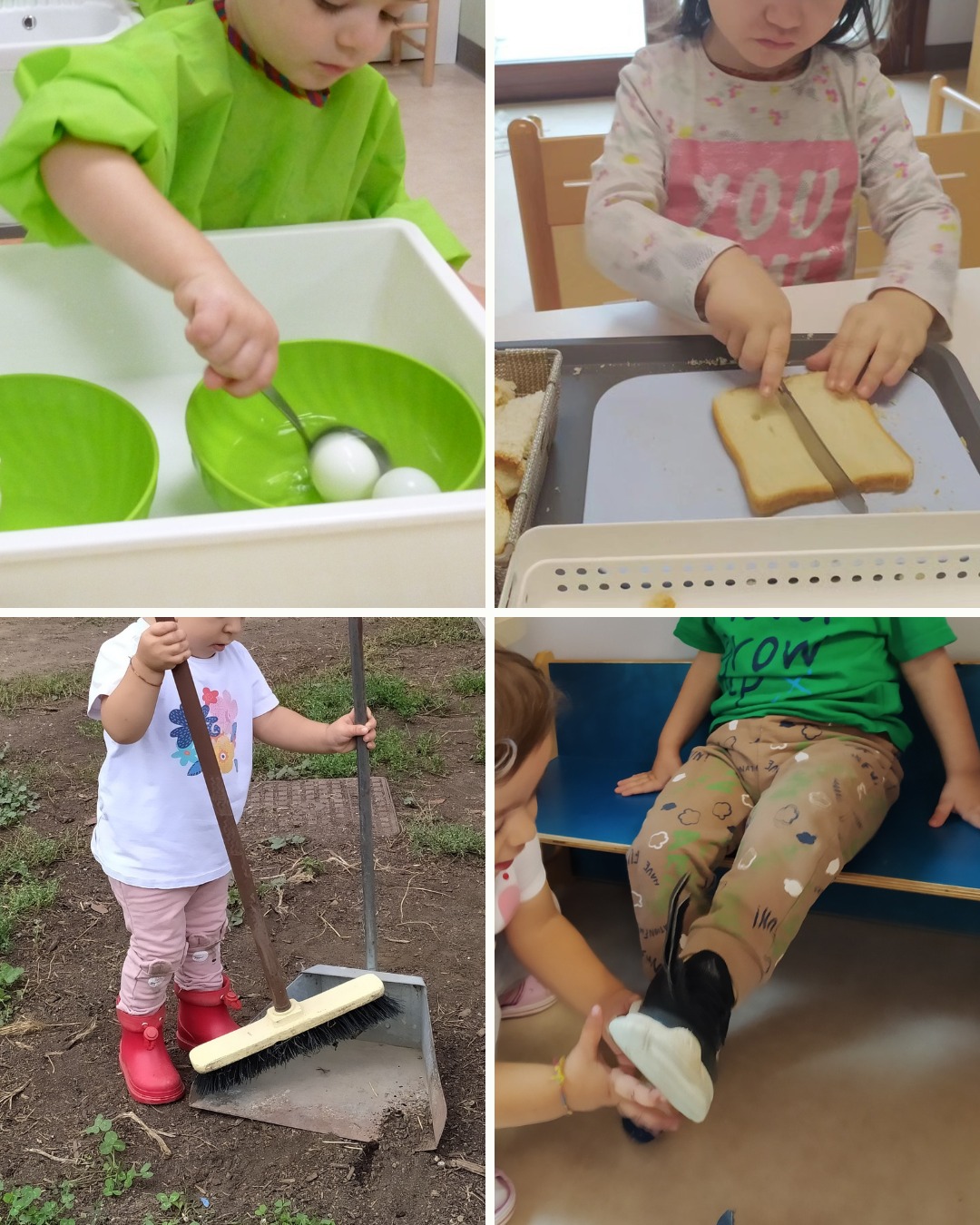 • offre ai bambini di età superiore ai 24 mesi di entrare in contatto con attività esperienziali che rispondono alla loro curiosità e desiderio di “fare vero” al fine di raggiungere le proprie autonomie come vestirsi, apparecchiare, iniziare le attività di vita pratica come impastare, travasare, lavare, classificare.